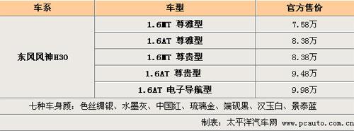 1月27日,備受期待的東風(fēng)風(fēng)神首款精品兩廂車東風(fēng)風(fēng)神H30,以“從容進(jìn)取、自由人生”為產(chǎn)品主張,在“自由之都”——成都拉開了全國自由上市帷幕。東風(fēng)汽車公司副總經(jīng)理、東風(fēng)乘用車公司總經(jīng)理李紹燭公布了東風(fēng)風(fēng)神H30五款上市車型的價(jià)格:1.6MT尊雅型7.58萬元,1.6MT尊貴型8.38萬元,1.6AT尊雅型8.38萬元,1.6AT尊貴型9.48萬元,1.6AT 電子導(dǎo)航型9.98萬元。