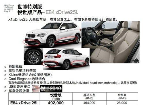 | 寶馬X1 xDrive25i悅世版 | 49.20 | 個(gè)性化輪轂、運(yùn)動(dòng)套件、世博徽標(biāo) |