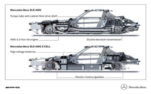 由于前軸的電動(dòng)機(jī)占用了一定的空間,SLS E-Cell的前懸將從SLS的雙叉臂變?yōu)槎噙B桿結(jié)構(gòu)。新車(chē)的鋰電池組位于車(chē)輛中部和后部,擁有480千瓦的功率。電池的冷卻則有專(zhuān)門(mén)的兩個(gè)循環(huán)系統(tǒng)完成。