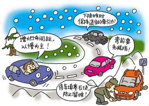 對(duì)于雪地的駕駛技巧,交警部門提醒車主,關(guān)鍵是以“慢”為主,并與前車保持足夠的剎車距離。然而,路況的復(fù)雜,讓很多駕駛員在發(fā)生側(cè)滑時(shí)感到緊張。“如果車輛打滑,方向盤要順著打滑方向輕輕地轉(zhuǎn),待車輪回正后,再輕輕地踩剎車!薄瓣P(guān)鍵是要慢,平穩(wěn)地減速及輕踩剎車,絕對(duì)不要在冰雪濕滑的路面上猛起步,或緊急剎車。”杭城資深出租車司機(jī)師傅們紛紛提供雨雪天氣駕駛竅門。