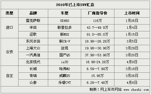 從年初至今,已經(jīng)上市的SUV車型達到了10款之多,而3月上市的就占到5款。其中上海大眾途觀在上市預(yù)售首月訂單就突破了4萬輛的;隨后上市的國產(chǎn)奧迪Q5訂單已經(jīng)排到明年,目前購買這兩款車仍需要加2.5萬-3萬元才能提到現(xiàn)車。而4月8日上市的iX35則又將在日系車市場掀起一股搶購熱潮。