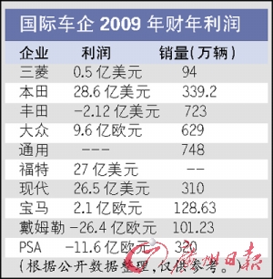 就拿現(xiàn)在全球風(fēng)頭“最勁”的大眾汽車來看,2009財年的營業(yè)額超過1000億歐元,但利潤只有區(qū)區(qū)9.6億歐元,利潤率還不到1%,如果按其629萬輛的銷量來計算,每輛車的平均利潤僅有100多歐元,大眾去年全年的盈利恐怕還沒有其在中國的兩個合資企業(yè)一汽大眾、上海大眾的合計多。曾經(jīng)是全球第一賺錢車企的豐田汽車受銷量下滑和“召回門”的影響,2009財年預(yù)計出現(xiàn)2億多美元的虧損;即使是國人看來利潤豐厚的豪華車制造商戴姆勒-奔馳和寶馬,日子也不是那么滋潤。寶馬集團去年在全球售出了近130萬輛汽車,但只有區(qū)區(qū)2.1億歐元的純利潤,而戴姆勒-奔馳更是出現(xiàn)了20多億歐元的虧損。