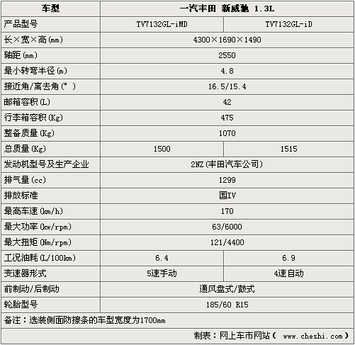 豐田改款新威馳依然由一汽生產(chǎn),同時(shí)將有6款車型推出,變速箱份為4速自動(dòng)和5速手動(dòng)。排量上分為1.3升與1.6升。長(zhǎng)4300mm×寬1690mm×高1490mm的車身尺寸也與老款車型保持一致,完全可以滿足年輕人在日常中的使用,并且新款車型提供了防擦條選裝件,可增加個(gè)性與實(shí)用性。