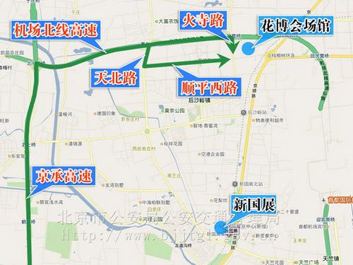 (一)由京承高速路經(jīng)機場北線高速路、火寺路出口、火寺路;或由機場北線高速路天北路出口經(jīng)天北路、順平西路至花博會場館自駕車停車場。