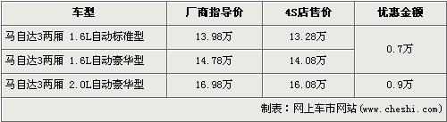 據(jù)經(jīng)銷商處銷售人員介紹,目前馬自達(dá)3兩廂有1.6L和2.0L兩種排量共三款車型在售。馬自達(dá)3兩廂2.0L車型優(yōu)惠為9000元,1.6L車型優(yōu)惠為7000元。經(jīng)7000元的優(yōu)惠后,1.6L自動(dòng)標(biāo)準(zhǔn)型和1.6L自動(dòng)豪華型售價(jià)仍為13.28萬(wàn)元和14.08萬(wàn)元,全系最高配的2.0L自動(dòng)豪華型經(jīng)9000元的優(yōu)惠后,售價(jià)為16.08萬(wàn)元。