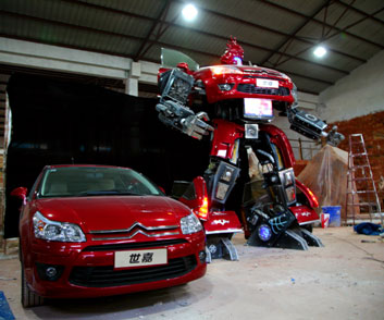 中新網(wǎng)4月15日電 2009上海國際車展即將開幕,除了輪番轟炸的多款新車和概念車外,又有重磅消息傳來。據(jù)悉,此前曾攜東風(fēng)雪鐵龍C2機(jī)器人“大鬧”廣州車展的南京車迷,這次又有大動作。一個高達(dá)4.5米、寬4米、厚3米、整體重量近2噸,帶聲、光、電系統(tǒng),以東風(fēng)雪鐵龍世嘉車為原形、結(jié)合中國傳統(tǒng)龍文化的巨型汽車人已經(jīng)在南京誕生,而且極有可能于上海車展現(xiàn)身。