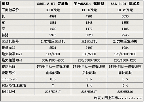 而在動(dòng)力配置方面,三款車(chē)分別為2.5T渦輪增壓、2.5L直六、2.0T增壓發(fā)動(dòng)機(jī),但從數(shù)據(jù)來(lái)看S80L的2.5T發(fā)動(dòng)機(jī)的優(yōu)勢(shì)比較明顯,但0-100km/h加速方面A6L更強(qiáng)僅為6.4S,而寶馬5系則要9.4S。而在驅(qū)動(dòng)形式方面,S80L和A6L都為前輪驅(qū)動(dòng),而寶馬5系則為后輪驅(qū)動(dòng)。