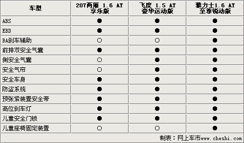 我們選取的三款車型均是各自車款中的高配車型,所以各自的安全配置都比較全面。ABS 、EBD、前排安全氣囊均為這三款車型的標(biāo)準(zhǔn)配置。同時安全車身、預(yù)緊安全帶、高位剎車燈也保證了它們的行駛安全,但是仔細看下來,標(biāo)致207的裝備似乎比較單薄,沒有配備策安全氣囊和安全氣簾。豐田雅力士裝配了BA剎車輔助系統(tǒng),該系統(tǒng)利用傳感器感應(yīng)駕駛者對制動踏板踩踏的力度與速度大小,從而使制動力快速產(chǎn)生,減少制動距離。在兒童保護方面,三款車型均配有兒童安全門鎖,雅力士還配備了后排兒童座椅固定裝置。