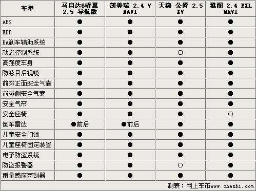 隨著汽車(chē)市場(chǎng)的日益成熟,安全能力逐漸也成為了車(chē)主最為關(guān)心的問(wèn)題?梢钥闯鯝BS+EBD和6安全氣囊均成為了這四款車(chē)型的標(biāo)準(zhǔn)配置。四款車(chē)型里天籟•公爵沒(méi)有配備車(chē)輛行駛動(dòng)態(tài)控制系統(tǒng)是一個(gè)不小的遺憾。在大多數(shù)車(chē)型都裝配了氣囊的情況下,馬自達(dá)6睿翼、凱美瑞和天籟•公爵還提供了安全座椅去保護(hù)前排乘員的頭頸部安全,這一點(diǎn)非常值得稱(chēng)贊。另外這四款車(chē)型均裝備了自動(dòng)防眩內(nèi)后視鏡,更加保障了夜間行車(chē)的安全。