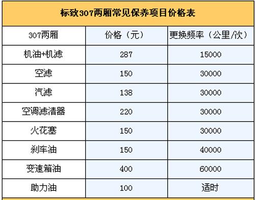 5.保養(yǎng)費(fèi): 我們向標(biāo)致4S店售后服務(wù)人員咨詢過,他們說307一大優(yōu)勢(shì)是保養(yǎng)周期比較長,1.5萬公里才需要保養(yǎng)一次,是同級(jí)車型中保養(yǎng)花費(fèi)最低的。通常新車首保在7500公里時(shí)進(jìn)行,以后每1.5公里保養(yǎng)一次。第二次1.5萬公里時(shí)的常規(guī)保養(yǎng)(更換機(jī)油機(jī)濾)需花費(fèi)287元;3萬公里保養(yǎng)(更換機(jī)油機(jī)濾+空濾+空調(diào)濾芯+汽濾+火花塞)為795元;4.5萬公里保養(yǎng)(更換機(jī)油機(jī)濾)花費(fèi)287元;6萬公里保養(yǎng)(更換機(jī)油機(jī)濾+空濾+空調(diào)濾芯+汽濾+火花塞)為795元。