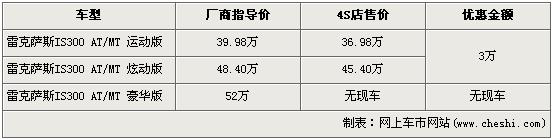 據(jù)4S店銷售人員介紹,因為廠家對IS300系列減產(chǎn),所以目前的現(xiàn)車并不是很多。目前炫動版和豪華版店內(nèi)都有現(xiàn)車,此兩款車在經(jīng)3萬元優(yōu)惠后,售價分別為36.98萬元和45.40萬元。而多了真皮座椅等配置的雷克薩斯IS300 豪華版店內(nèi)沒有現(xiàn)車銷售,所以不在此次優(yōu)惠列隊中。