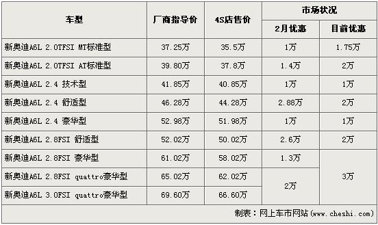 記者從奧迪地區(qū)經(jīng)銷商處了解,奧迪新A6L全系有不同程度優(yōu)惠調(diào)整,最高達到了3萬元。入門級的2.0TFSI手動標(biāo)準(zhǔn)型優(yōu)惠金額上漲到了1.75萬元,2.0TFSI自動標(biāo)準(zhǔn)型優(yōu)惠金額也上漲到了2萬元。2.4L排量除了舒適型優(yōu)惠金額減小到了2萬元外,同排量其他車型優(yōu)惠金額均沒變。全系高配的2.8FSI四驅(qū)型和3.0FSI四驅(qū)型的售價也從2萬元升到了3萬元,達到了全系最高。