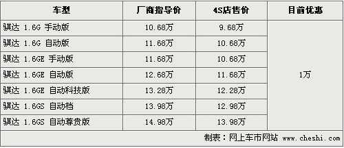 騏達(dá)一直是東風(fēng)日產(chǎn)系列車型中最為暢銷的車型之一,同時(shí)也是在同級別車型中表現(xiàn)最為突出的車型之一,自上市以來受到眾多消費(fèi)者的喜愛。根據(jù)網(wǎng)上車市價(jià)格監(jiān)測系統(tǒng)顯示,目前這款車現(xiàn)車比較緊張,購車的消費(fèi)者可享受1萬元的現(xiàn)金優(yōu)惠,具體行情如下: