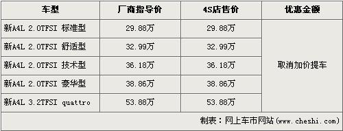 奧迪新A4L自從廣州車展發(fā)布以來受到眾多消費者關注,全新的淚眼設計外觀再加上多項高科技安全配置使這款車在同級別車中更凸顯出奧迪一貫的品質。記者最近從北京地區(qū)奧迪經銷商處了解,目前新A4L新車取消了加價提車,具體車型價格如下: