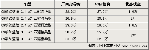 歐藍德是三菱引入國內(nèi)銷售的中型SUV車型,經(jīng)過09款小改款后,新款在外觀上增加了冷銀色換擋裝飾板,鍍鉻門內(nèi)把手,鍍鉻側(cè)窗裝飾物,鍍鉻尾門裝飾條等等,同時內(nèi)飾也有局部的變動和提升。根據(jù)網(wǎng)上車市價格監(jiān)測系統(tǒng)顯示,目前歐藍德新老款車的優(yōu)惠幅度均在2萬元內(nèi),具體車型以及價格如下: