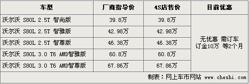 S80L加長版是沃爾沃專門為中國市場量身打造的一款全新豪華車,軸距加長140毫米,配置更加豪華,以滿足中國消費者的需求。國產(chǎn)加長版包括了2.5T和3.0兩個排量共5款車型。目前北京地區(qū)加長版車型現(xiàn)車緊缺,均需要提前預訂,具體行情如下: