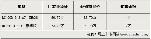 根據(jù)網(wǎng)上車市價(jià)格監(jiān)測(cè)系統(tǒng)顯示,目前在80萬級(jí)別的進(jìn)口SUV中,寶馬X5,奧同Q7的優(yōu)惠都 在4萬元的幅度,可見4萬元的優(yōu)惠是一個(gè)比較常見的讓利。而雷克薩斯RX350自上市以來的優(yōu)惠最高大約去到6萬元左右,在新款上市后,舊款RX350的剩車已經(jīng)不多。