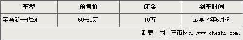 據(jù)北京寶馬經(jīng)銷店銷售人員介紹,將引進(jìn)國內(nèi)的全新一代寶馬Z4分為sDrive30i和sDrive35i兩種車型,售價預(yù)計為60-80萬元。目前店內(nèi)可以接受新Z4的預(yù)訂,訂金為10萬元。寶馬Z4 sDrive35i車型搭載了與寶馬X6 35i相同的3.0升雙渦輪直6引擎,最大功率達(dá)到了225Kw,最大扭矩達(dá)到了400Nm,F(xiàn)車方面銷售人員透露,最早的一批現(xiàn)車最快將會在6月份抵達(dá)北京寶馬經(jīng)銷店,車型應(yīng)該為sDrive30i,交訂金的消費(fèi)者將會第一時間提到現(xiàn)車。