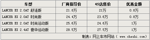 以純進(jìn)口車身份銷售的三菱LANCER EX上市后,憑借上佳的質(zhì)量及性能受到消費(fèi)者喜愛(ài)。據(jù)網(wǎng)上車市網(wǎng)站得到的消息,近期北京各家進(jìn)口三菱經(jīng)銷商處已經(jīng)出現(xiàn)了價(jià)格松動(dòng),除低配車型優(yōu)惠仍為8000元外,2.0L高配車型以及頂配的2.4L豪華運(yùn)動(dòng)版車型均可給出10000元優(yōu)惠。詳情如下: