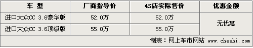 據(jù)4S店銷售人員介紹,目前進口大眾CC現(xiàn)車已經(jīng)到店,共分兩款車型,3.6豪華版售價為52萬元,頂級版售價為55萬元。這兩款車主要差別體現(xiàn)在配置上,頂級版增加了導(dǎo)航和自動泊車系統(tǒng)等高端配置。消費者現(xiàn)在購車的話暫時還沒有優(yōu)惠幅度出現(xiàn)。現(xiàn)車方面,4S店有黑色、白色、亮銀色、藍色等可供消費者選擇。內(nèi)飾分別有黑色和黑米兩款可供挑選。