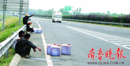 柴油緊張催生了眾多倒油族,9日,記者在京福高速公路曲阜服務(wù)區(qū)附近,發(fā)現(xiàn)一些村民在高速公路上向過路司機(jī)兜售柴油。柴油大多裝在50升的塑料桶內(nèi),見到大車他們便揮手示意停車。據(jù)服務(wù)區(qū)加油站陳站長介紹,村民兜售的柴油有不少是劣質(zhì)柴油,極易造成安全隱患,而這些人沿路兜售柴油的行為極易導(dǎo)致高速行駛的車輛追尾。(郭波 王勇)