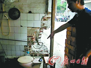 昨日上午,記者在順德區(qū)供電局附近看到,紅廟一街十五巷右邊的譚氏民居與一家水果店相接的墻角,被撞出一個(gè)能鉆進(jìn)一個(gè)大人的洞口,水果店的一扇2米長(zhǎng)的墻體完全開(kāi)裂,譚氏民居內(nèi)的馬桶被撞后成了碎片,門(mén)邊的一堵墻體也撞倒了,屋里到處是磚頭。此時(shí),巷子左邊一家磨具店的老板得知店外出事后,卻怎么也打不開(kāi)卷閘門(mén),最后通過(guò)“武力”撬開(kāi)門(mén)后才發(fā)現(xiàn)大門(mén)外部已被撞癟。