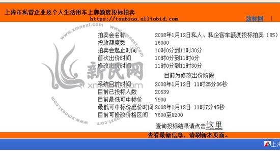 11時30分,本市2008年第一次私人、私營企業(yè)客車額度競標結(jié)束,新民網(wǎng)薛驍翔從現(xiàn)場發(fā)回最新消息稱,本次私車額度平均中標價為23370元,比上月減少32672元,下跌近60%;最低中標價為8100元,比上月足足跌了41900元,投標人共計20539人。