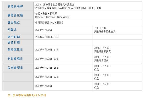 展覽時(shí)間:國(guó)內(nèi)外整車、商用車的展覽時(shí)間是 2008年4月22日至4月28日;國(guó)內(nèi)外零部件的展覽時(shí)間為2008年4月22日至4月25日。