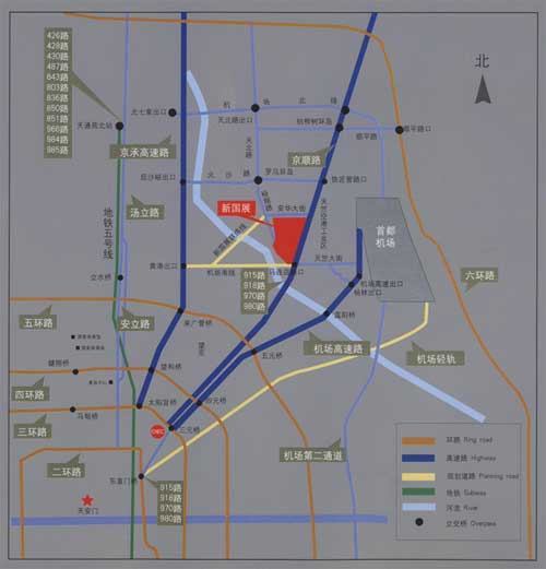 中國國際展覽中心新館位于北京順義天竺空港城商務(wù)區(qū),東鄰首都國際機(jī)場,西靠溫榆河生態(tài)走廊,交通便利,風(fēng)景優(yōu)美。周邊有京密路、五環(huán)、六環(huán)、機(jī)場高速、京承高速、機(jī)場北線組成的高等級公路網(wǎng),公共交通包括輕軌、公交、出租及機(jī)場巴士。
