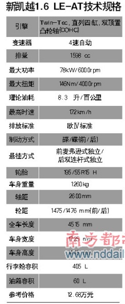 新凱越沿用了舊款車型的動力系統(tǒng),不過經(jīng)過重新調(diào)校之后,其1.8升和1.6升DOHC16VTwin-Tec引擎都達(dá)到了歐IV排放標(biāo)準(zhǔn)。我們此次試駕的車型配備了1.6升發(fā)動機(jī),在6000轉(zhuǎn)時(shí)可達(dá)到78kW的最大功率;在3600轉(zhuǎn)時(shí),提供146Nm的最大扭矩,在同級車型當(dāng)中表現(xiàn)居中。傳動系統(tǒng)上,與這款1.6升四缸引擎相匹配的是一臺鋸齒形排列的4速自動變速箱。從廠家提供的資料上看,為了獲得更好的經(jīng)濟(jì)性能,這款變速器配備有“智能切換空擋”功能。
