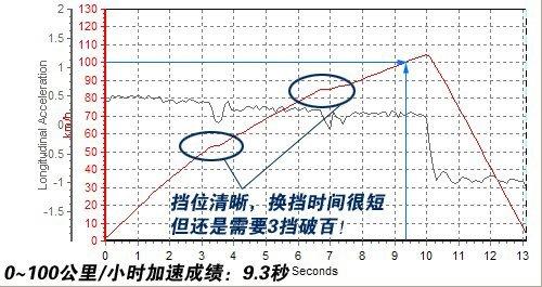 成績雖然出來了,但測試過程我們還是要關注一下。由于是6擋密齒比設定,酷寶需要換上3擋速度才能破百,剛才我們已經(jīng)說了,換擋行程和擋把過長都會影響成績,從圖中可以看出,我們的擔心確實映現(xiàn)了。換擋影響了時間,但總體來看9.3s的成績比較令人滿意。