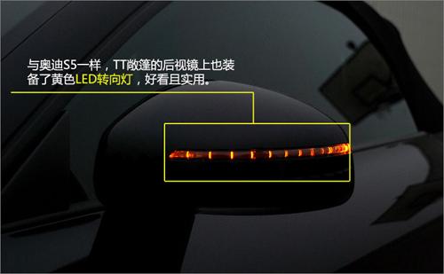 在車頭大燈下使用LED裝飾燈大獲成功之后,奧迪在TT敞篷的后視鏡上亦裝備了黃色的LED轉(zhuǎn)向燈,在夜間行駛時作用很大。