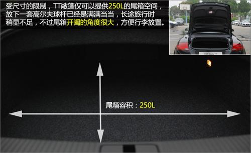 受到車身和軸距尺寸的限制,TT敞篷僅可以提供250L的尾箱空間,與奔馳SLK相比,少了50L。放下一套高爾夫的球桿已經(jīng)是滿滿當當,長途旅行時稍顯不足。不過尾箱的開闔角度很大,方便行李的放置。