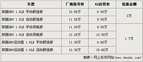 據(jù)經(jīng)銷商處銷售人員介紹,凱越HRV共有6個車型在售,近期除了舒適版現(xiàn)金優(yōu)惠仍然是2萬元外,其他4款車型的優(yōu)惠都上升到了1.7萬元。入門車型的凱越HRV 1.6LE 手動舒適版現(xiàn)金優(yōu)惠售價仍為8.58萬元。而導(dǎo)航版與運動版車型優(yōu)惠金額都從1.6萬元漲到了1.7萬元,但是此兩版車型店內(nèi)均無現(xiàn)車,欲購買的消費者需交訂金1萬元,最早兩周內(nèi)可以提車。