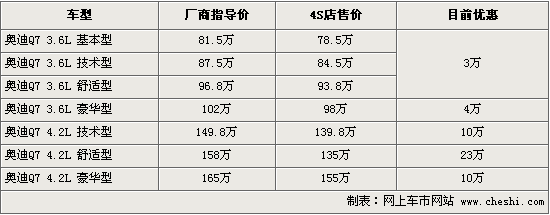 據(jù)奧迪4S店銷售人員介紹,目前銷售的奧迪Q7包括了3.6和4.2排量共7款車型。消費者在購買的同時可以選擇個性化選裝配置,其中包括了座椅顏色,內(nèi)飾顏色,剎車盤,音響等一系列配置,據(jù)介紹,選擇個性化配置后,車價將有相應(yīng)增加。同時消費者可以直接購買原車型,目前全車系3.6排量三款車優(yōu)惠3萬元現(xiàn)金,豪華版優(yōu)惠4萬。而4.2舒適型最低可優(yōu)惠到135萬,降幅達23萬。目前4S店現(xiàn)車主要以黑色為主,內(nèi)飾有灰色、米色可供選擇。