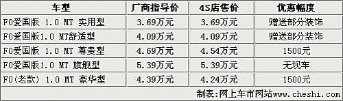 據(jù)比亞迪汽車4S店銷售人員介紹,現(xiàn)在比亞迪F0愛(ài)國(guó)版igo系列車型的現(xiàn)車比較齊全,只有旗艦型沒(méi)有現(xiàn)車,但消費(fèi)者可以預(yù)訂。售價(jià)3.99萬(wàn)元的老款舒適型現(xiàn)在已經(jīng)停產(chǎn),而老款豪華型目前還有部分現(xiàn)車銷售。另外,比亞迪FO老款豪華型和尊貴型目前都可以優(yōu)惠現(xiàn)金1500元,實(shí)用型和新舒適型只可以贈(zèng)送部分裝飾。