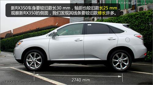新RX350車身要較舊款長30 mm,軸距也較舊款長25 mm。觀察新RX350的側(cè)面,我們發(fā)現(xiàn)其線條要比舊款修長許多,一改舊款車型給人的臃腫之感。