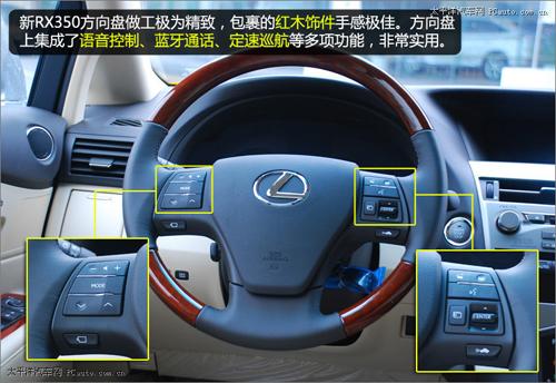 新RX350方向盤做工極為精致,包裹的木質(zhì)飾件手感極佳。方向盤上集成了語音控制、藍牙通話、定速巡航等多項功能,非常實用。