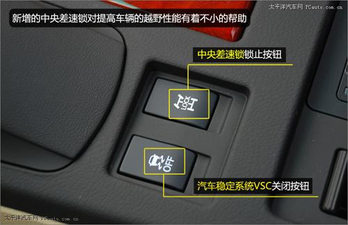 在排檔桿的后方,是中央差速鎖鎖止按鈕和汽車穩(wěn)定系統(tǒng)VSC關閉按鈕。汽車穩(wěn)定系統(tǒng)VSC相當于德系車常見的ESP系統(tǒng),對于穩(wěn)定高速行駛的車輛有著很大的幫助。此外,新RX350還標配了上坡輔助系統(tǒng)HAC、防抱死制動系統(tǒng)ABS配制動力輔助系統(tǒng)BA、電子制動力分配系統(tǒng)EBD、牽引力控制系統(tǒng)TRC、汽車動態(tài)中和管理系統(tǒng)VDIM,可以給駕駛員和乘客以最好的保護和輔助。