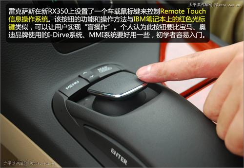 雷克薩斯在新RX350上設置了一個車載鼠標鍵來控制最新的Remote Touch信息操作系統(tǒng)。該按鈕的功能和操作方法與IBM筆記本上的紅色光標鍵類似,可以讓用戶實現(xiàn)“盲操作”。只需輕輕擺動該按鈕,車載電腦屏幕上的鼠標鍵便會按照指示移動。個人認為此按鈕要比寶馬、奧迪品牌使用的I-Dirve系統(tǒng)、MMI系統(tǒng)好用一些,初學者也容易入門。據(jù)悉,這套控制系統(tǒng)將逐步推廣到雷克薩斯全系車型上。