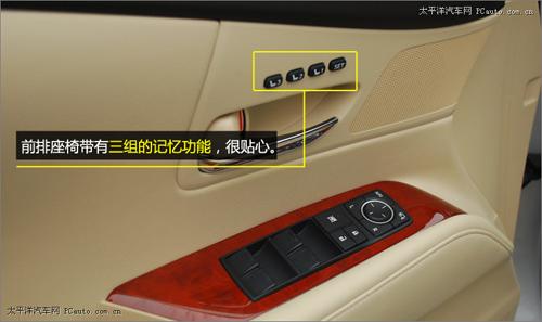 將目光轉移到中央扶手側,我們發(fā)現(xiàn)雷克薩斯的前排座椅帶有三組記憶功能,很貼心。電動后視鏡調(diào)節(jié)按鈕、車窗升降按鈕亦集中在駕駛員一側的門把手上。
