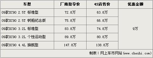 據(jù)沃爾沃經銷商處銷售人員介紹,目前店內的09款XC90車型全系都有9萬元的現(xiàn)金優(yōu)惠,并且此次優(yōu)惠活動截止到7月1日。經優(yōu)惠后,2.5T標準型的售價跌破70萬元,僅售63.8萬元。2.5T 帆船紀念版經9萬元優(yōu)惠后,售價從75.8萬元下降到了66.8萬元。兩款3.2L排量車型經優(yōu)惠后售價降為74.8萬元及80.8萬元,頂配的4.4L旗艦車型售價降為了138.8萬元。銷售人員還介紹,XC90全系車型齊全,消費者挑選的空間較大。