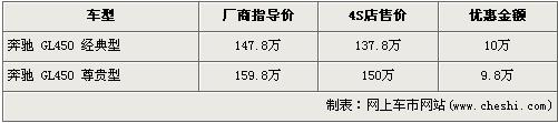 據(jù)經銷商處銷售人員介紹,目前國內在售的奔馳GL級分為GL450 經典版與GL450 尊貴版,上個月兩款車型的優(yōu)惠金額分別為3萬元和4.8萬元,近日奔馳GL系的優(yōu)惠金額暴增,優(yōu)惠近額分別漲到了10萬元和9.8萬元。經優(yōu)惠后,低配車型的經典版售價將為了137.8萬元,首次跌破140萬,高配的尊貴版車型售價也降為了150萬元。