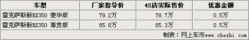 據(jù)北京雷克薩斯4S店銷售人員介紹,目前各4S店均有新RX350的現(xiàn)車銷售,而且貨源相對比較充足,F(xiàn)在購車在可以得到5000元的現(xiàn)金優(yōu)惠還,還可以得到商家贈送的簡單裝飾。銷售人員還表示,新款RX350由于原裝進口車型,所以車型的手續(xù)還有到店。消費者在購車后還需要等待10個工作日左右才可以上牌。