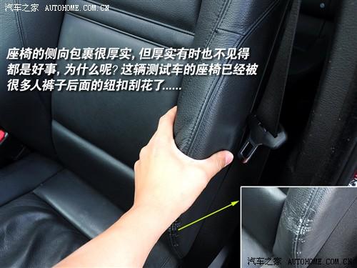 前排座椅的包裹性非常出色,特別是靠背兩側(cè)的包裹隆起很高,但我們也發(fā)現(xiàn)這種座椅的一點(diǎn)不足之處:側(cè)面很容易被褲子后兜的紐扣刮到,時(shí)間稍長就成了試駕車現(xiàn)在的樣子:真皮已經(jīng)被刮花了。