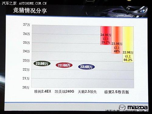 通過(guò)睿翼先推2.5L車(chē)型的并且老款車(chē)型不停產(chǎn)的策略使馬自達(dá)6的產(chǎn)品線將會(huì)有著十分強(qiáng)大的產(chǎn)品結(jié)構(gòu),目前市場(chǎng)上面馬自達(dá)6最低配車(chē)型的成交價(jià)(個(gè)別地區(qū))已經(jīng)跌破15萬(wàn)元,這對(duì)于一款合資中型車(chē)來(lái)說(shuō)有絕對(duì)的優(yōu)勢(shì),新上市的睿翼頂配車(chē)型售價(jià)為24.98萬(wàn)元,這使馬自達(dá)6的產(chǎn)品線跨越15-25萬(wàn)元的售價(jià)區(qū)間(雖然是新老車(chē)型的區(qū)別,對(duì)于廠商來(lái)說(shuō)畢竟都是馬自達(dá)6系列的產(chǎn)品,畢竟對(duì)于商家無(wú)論黑貓白貓能抓耗子的就是好貓)。