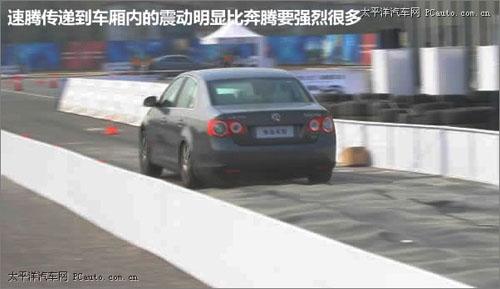 濕滑路面體驗這個項目主要是模擬冰雪路面的對于車輛的操控,在光滑的鋼板上潑上水附著力減小,在通過彎道時速騰依舊過早的出現(xiàn)轉(zhuǎn)向不足的情況,不過方向盤的指向依舊保持的較為精準。奔騰在高速過彎時側(cè)傾要小于速騰,不過路感不是特別清晰,電子穩(wěn)定系統(tǒng)起到的作用非常明顯,底盤在舒適性和運動性間找到了平衡點。