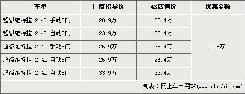 據(jù)4s店銷售人員介紹,目前店內(nèi)銷售的新超級維特拉全系優(yōu)惠5000元。低配的3門版2.4L 5速手動(dòng)車型最低售價(jià)降為20.4萬元,而排量稍大采用5速自動(dòng)變速器的5門版3.2L車型經(jīng)優(yōu)惠后售價(jià)也降為33.4萬元,是全系最高價(jià)。店內(nèi)現(xiàn)車顏色方面,新超級維特拉有黑、灰、白三個(gè)顏色供消費(fèi)者選購。