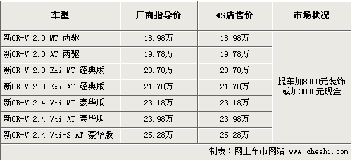 據(jù)4S店銷售人員介紹,目前消費(fèi)者購買新CR-V現(xiàn)車的話仍然需要在店內(nèi)做8000元的裝飾,或者加3000元現(xiàn)金,相比之前加價(jià)減少。目前現(xiàn)車方面主要有白色、銀色和黑色等款可供選擇。入門級手動(dòng)檔車型目前沒有現(xiàn)車,預(yù)訂的話需要交訂金5000元,一個(gè)星期左右便可以順利提車。