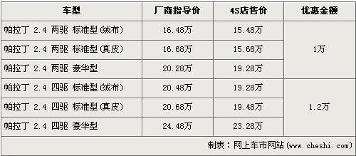 據(jù)4s店銷售人員介紹,帕拉丁兩驅(qū)車型的優(yōu)惠金額為1萬元,四驅(qū)車型的優(yōu)惠金額為1.2萬元。帕拉丁為2.4L,車系分為前置后驅(qū)和前置四驅(qū)兩種驅(qū)動(dòng)形式,每種驅(qū)動(dòng)形式中又分為標(biāo)準(zhǔn)版及豪華版,標(biāo)準(zhǔn)版分為絨布座椅或真皮座椅。絨布座椅全系最低配的帕拉丁 2.4兩驅(qū)標(biāo)準(zhǔn)版經(jīng)優(yōu)惠后售價(jià)降為15.48萬元,而操縱性能更加穩(wěn)健,全系最高配的帕拉丁 2.4四驅(qū)豪華版經(jīng)優(yōu)惠后售價(jià)也降到了23.28萬元。目前帕拉丁兩驅(qū)與四驅(qū)的豪華車型均無現(xiàn)車,欲購買的消費(fèi)者需交訂金1萬元,兩周后可提車。